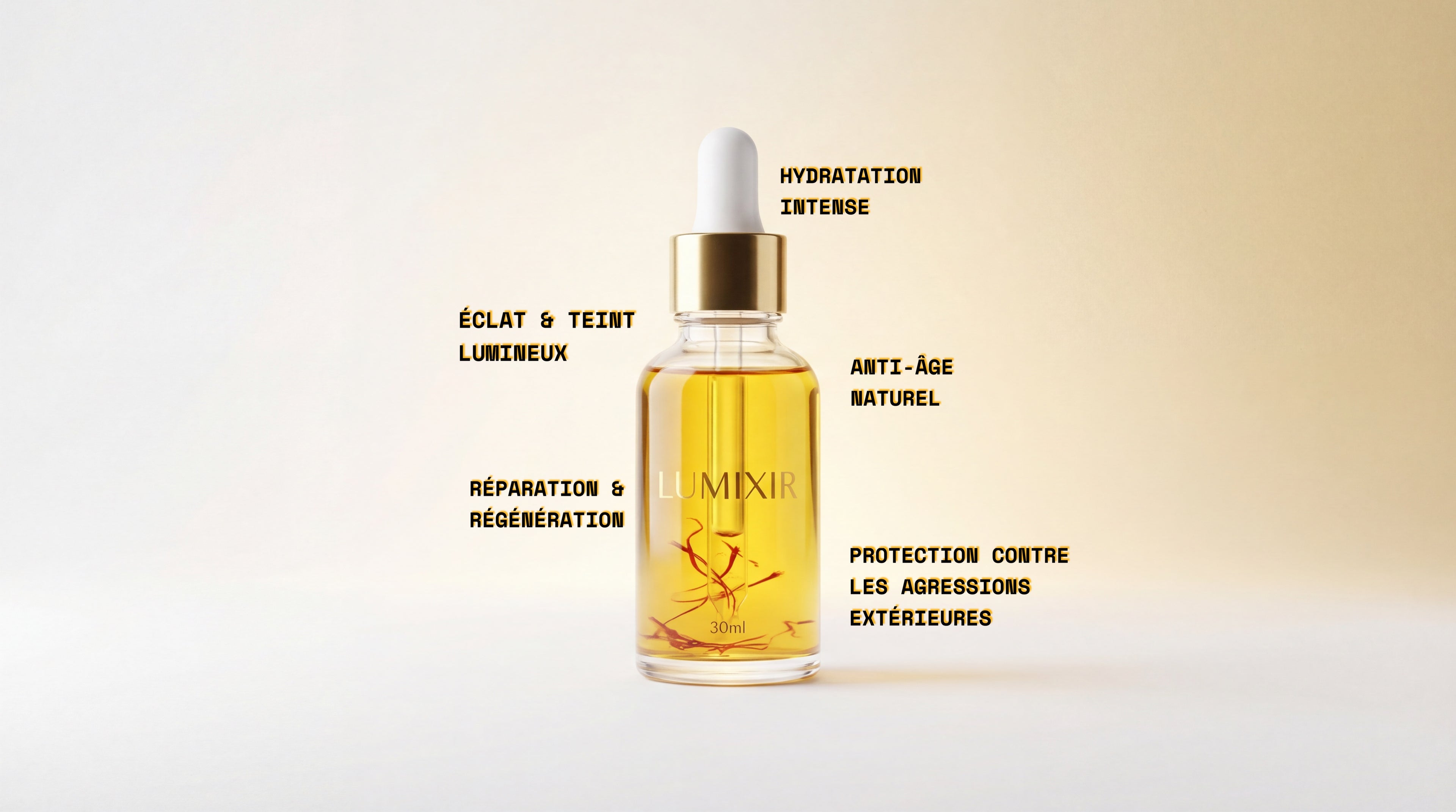 Découvrez LUMIXIR, le meilleur sérum anti-rides naturel, formulé à partir de l’huile de pépins de figue de barbarie, de l’huile d’argan bio et de véritables filaments de safran. Un soin d’exception qui combine les ingrédients les plus recherchés en cosmétique anti-âge pour offrir à votre peau une régénération profonde et durable.